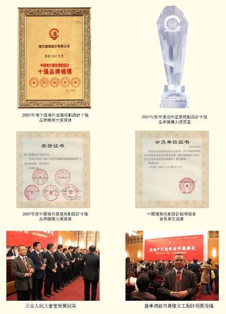 燦文建築設計有限公司於2008年1月9日在北京人民大會堂,榮獲“2007年度中國境外建築規劃設計十強品牌機構”大獎,並獲中國建築規劃設計行業年會組委會頒授榮譽證書、獎牌及獎盃。