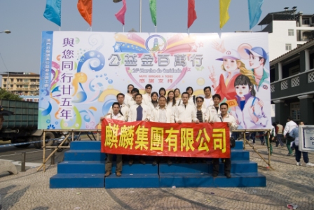 麒麟集團有限公司部分員工在集團行政總裁黃燦文先生的帶領下,參與了12月14日上午十時在觀音像旁舉行第廿五屆公益金百萬行。澳門特區行政長官何厚鏵,中聯辦主任白志健,外交部駐澳特派員盧樹民,澳門教區主教黎鴻昇,澳門日報讀者公益基金會名譽會長何鴻燊、廖澤雲、胡順謙、李成俊,公益基金會名譽副會長崔世昌,公益基金會會長劉衍泉、理事長馮志強主持剪綵起步儀式。特區政府各級官員及公益基金會負責人,與各界善長仁翁結伴同行,為公益獻愛心。